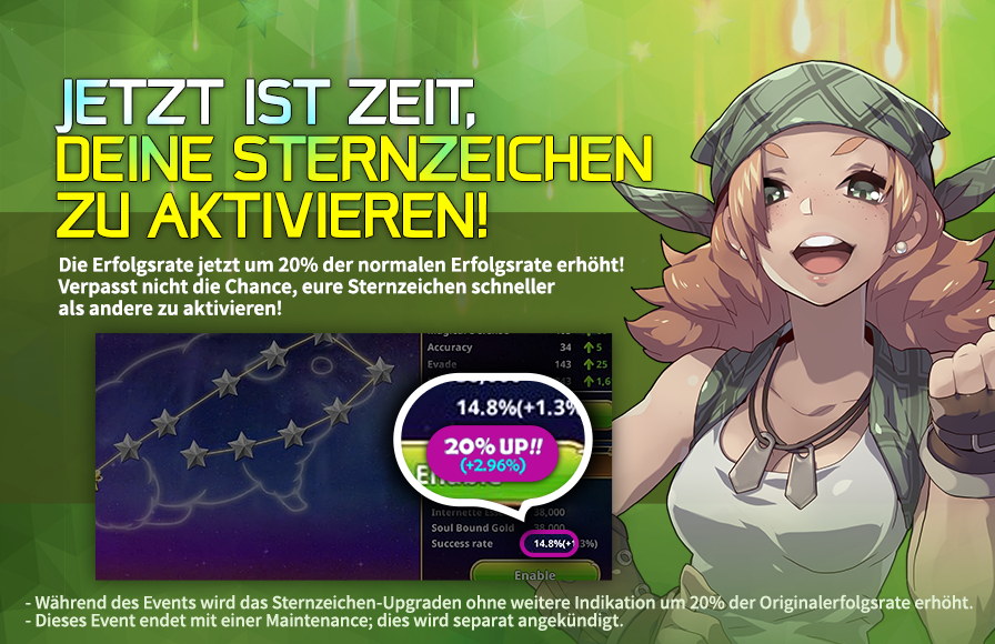 BESCHREIBUNG: Eure Erfolgsrate ist um 20% der ursprünglichen Erfolgsrate erhöht! Verpasst nicht die Chance, die Sternzeichen schneller als andere zu aktivieren!