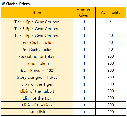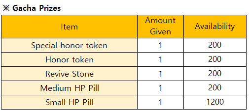 Description: You can obtain random items in this Limited Gacha. Use this chance to obtain various items and a chance to win a rare prize!
