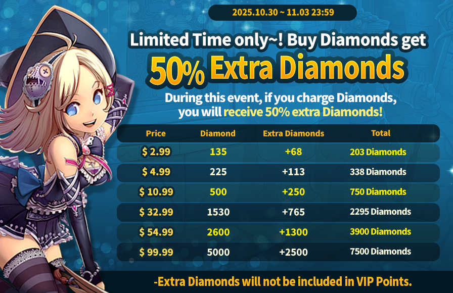 If you charge Diamonds, you will receive 50% extra Diamonds!*