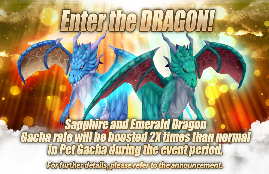 Sapphire and Emerald Dragon Gacha rate will be boosted 2X times than normal in Pet Gacha during the event period.