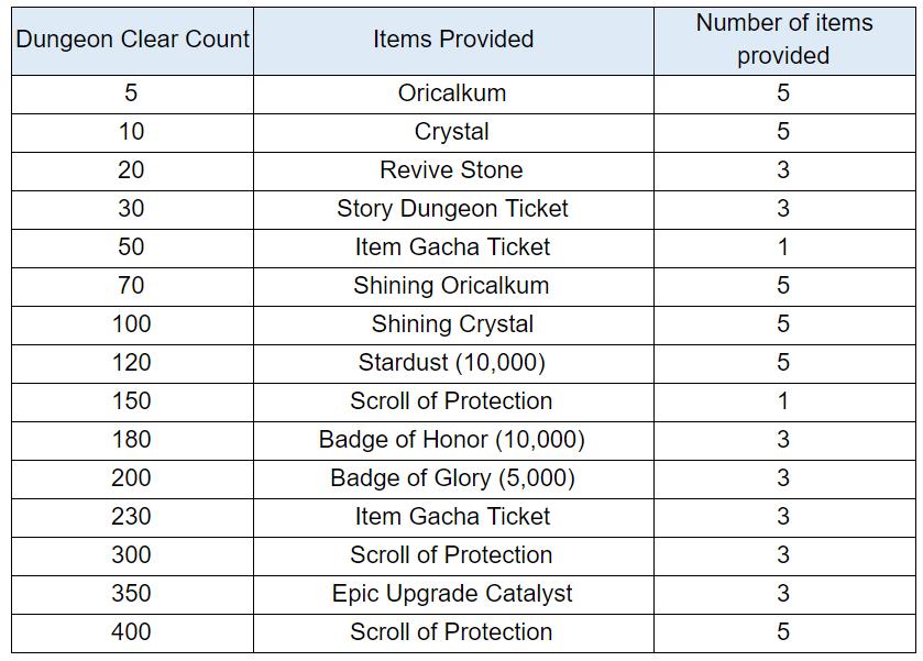 The Dungeon Clear count for this event only counts Story, Daily, and Party Dungeons. Please keep this in mind when proceeding with this event.