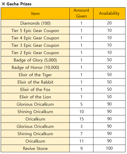 Description: You can obtain random items in this Limited Gacha. Use this chance to obtain various items and a chance to win a rare prize!