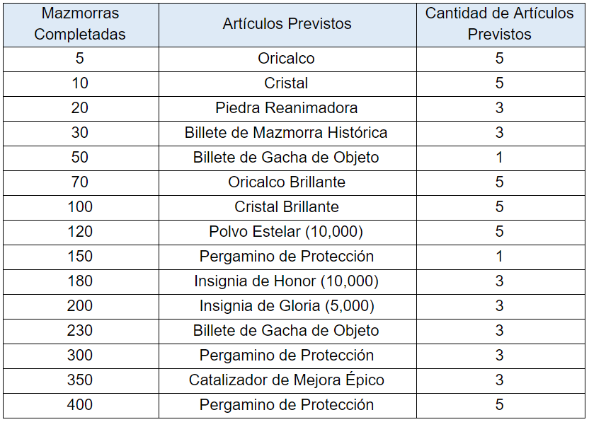 Para éste evento, solo las Mazmorras Histórica, Diarias, y de Grupo se contabilizarán para los puntos de Mazmorras Completadas.