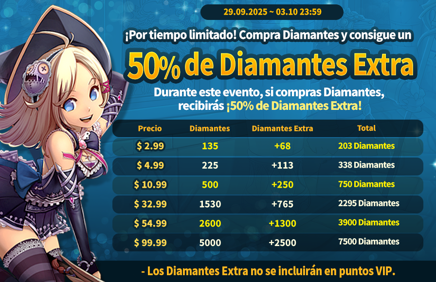• DESCRIPCIÓN: ¡Si compra Diamantes, recibirá un 50% extra de Diamantes! *