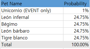 ★Lista de Mascotas de Gacha (de10 Mascotas de Gacha, si una o más de 9 fueron Épicas, la probabilidad para la 10ª)
