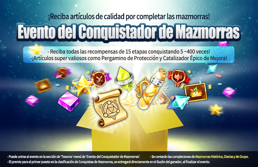 En cada servidor, el jugador con mayor compleción de Mazmorras, será premiado con una recompensa especial de 10,000 Diamantes.