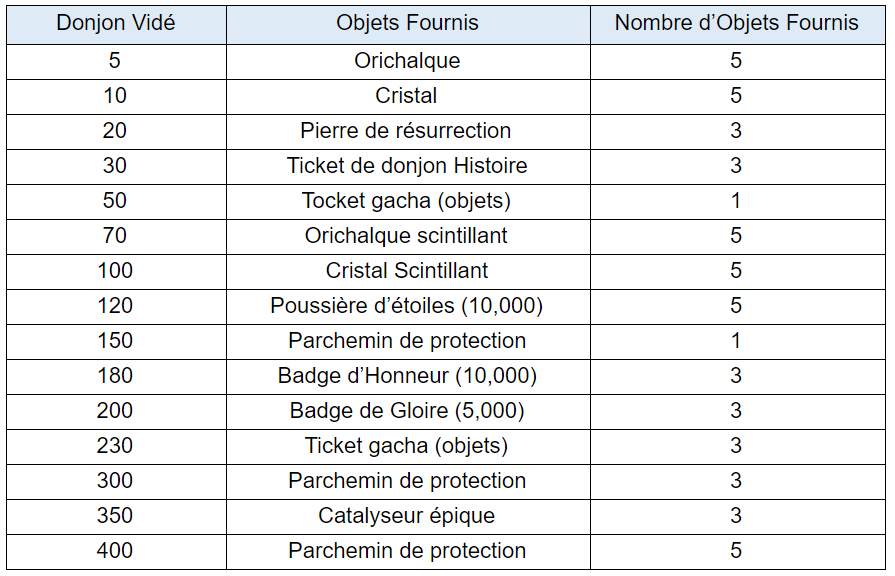Pour les récompenses d'événements, veuillez consulter le tableau ci-dessous afin d’obtenir plus de détails.