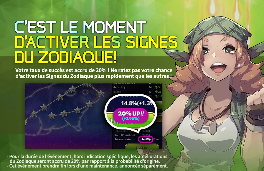DÉSCRIPTION: Votre taux de réussite est augmenté de 20% de la chance initiale! Ne manquez pas cette chance d'activer les signes du zodiaque plus rapidement que les autres!
