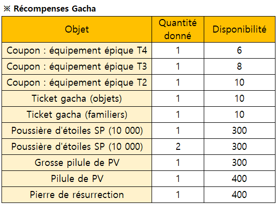 Pour les récompenses d'événements, veuillez consulter le tableau ci-dessous afin d’obtenir plus de détails.