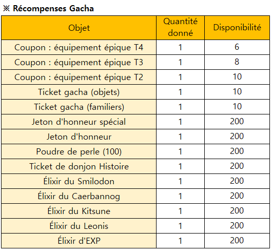 Description: Vous pouvez obtenir des objets au hasard dans ce Gacha Limité. Profitez de cette chance pour obtenir divers objets et courir la chance de gagner un prix rare !