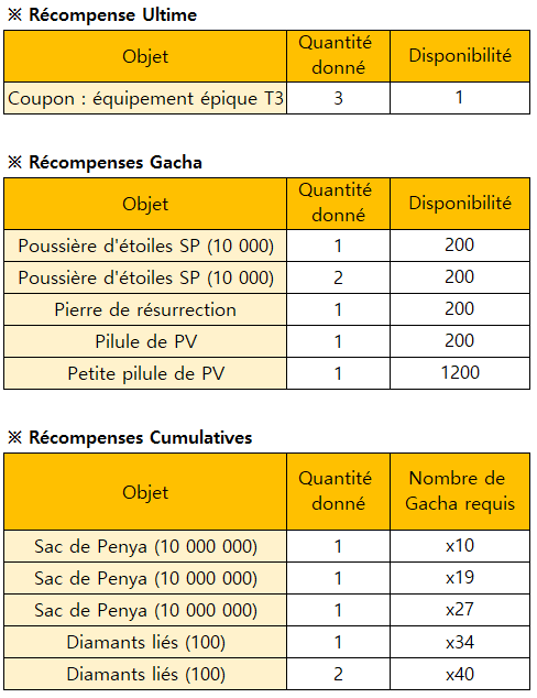 Pour les récompenses d'événements, veuillez consulter le tableau ci-dessous afin d’obtenir plus de détails.