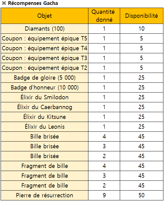 Description: Vous pouvez obtenir des objets au hasard dans ce Gacha Limité. Profitez de cette chance pour obtenir divers objets et courir la chance de gagner un prix rare !