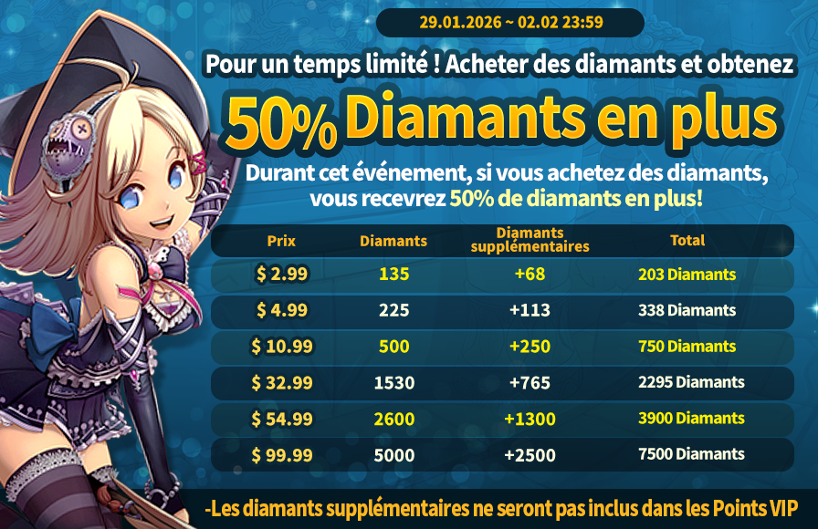 • DESCRIPTION: Si vous achetez des diamants, vous recevrez 50% de diamants en plus!*