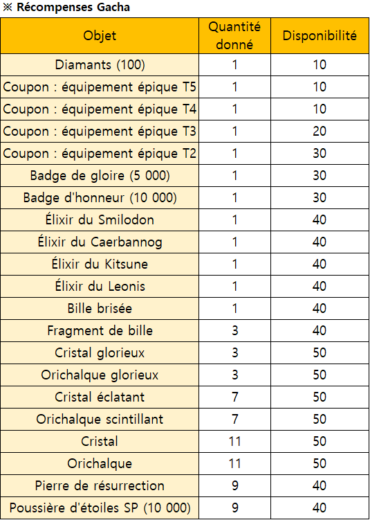 Description: Vous pouvez obtenir des objets au hasard dans ce Gacha Limité. Profitez de cette chance pour obtenir divers objets et courir la chance de gagner un prix rare !