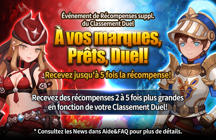 Les 50 meilleurs duellistes de chaque serveur recevront des prix améliorés une fois par jour. Vous recevrez un prix en fonction de votre classement Duel, qui est actualisé tous les jours à 00h00, heure du serveur. Les rangs 1 à 3 peuvent gagner 5 fois la récompense normale, les rangs 4 à 10 peuvent gagner 3 fois et les rangs 11 à 50 peuvent gagner 2 fois la récompense normale.