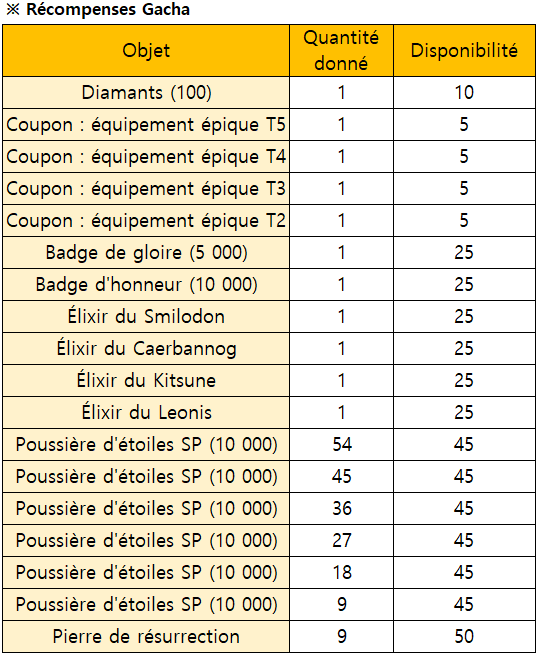 • Box Zodiac Spéciale: Obtenez 1 des objets suivants au hasard [Badge d'honneur SP (10K) / Badge de gloire SP (10K) / Poussière d'étoiles SP (300K) / Poussière d'étoiles SP (500K) / Poussière d'étoiles SP (1M)]