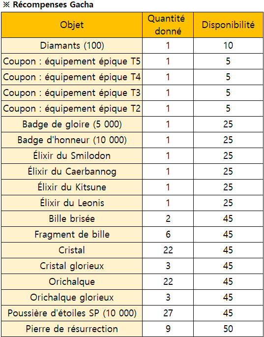 Description: Vous pouvez obtenir des objets au hasard dans ce Gacha Limité. Profitez de cette chance pour obtenir divers objets et courir la chance de gagner un prix rare !