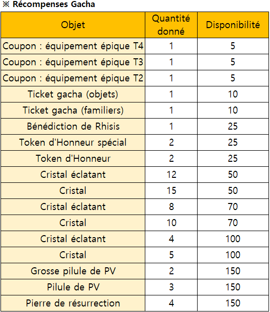 Pour les récompenses d'événements, veuillez consulter le tableau ci-dessous afin d’obtenir plus de détails.