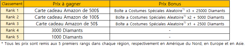 - En cas d'égalité, le classement final sera établi en fonction de la Puissance de Combat à 00:00 du jour où la finale a lieu.