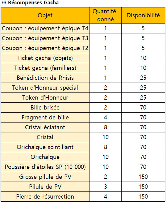 Description: Vous pouvez obtenir des objets au hasard dans ce Gacha Limité. Profitez de cette chance pour obtenir divers objets et courir la chance de gagner un prix rare !