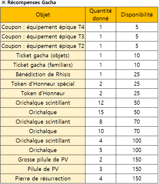Pour les récompenses d'événements, veuillez consulter le tableau ci-dessous afin d’obtenir plus de détails.