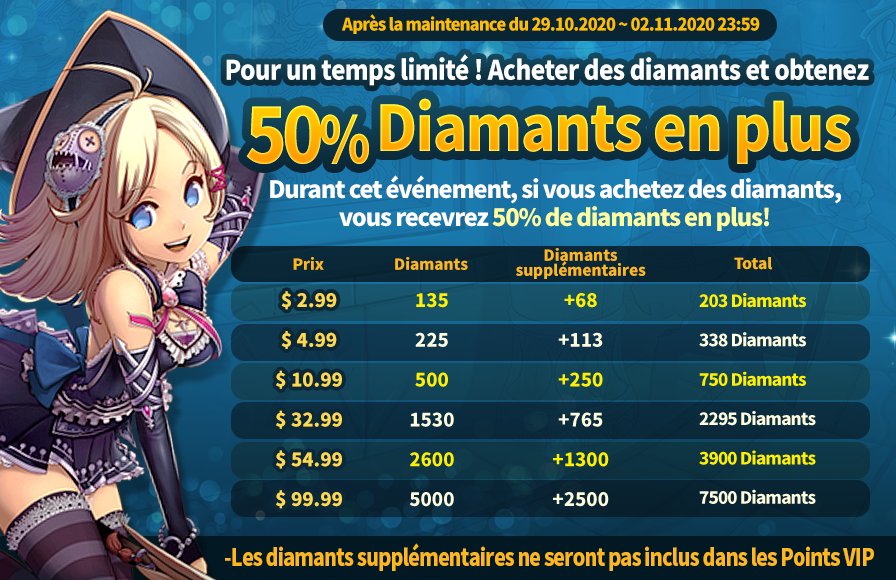 • DESCRIPTION: Si vous achetez des diamants, vous recevrez 50% de diamants en plus !*