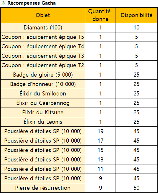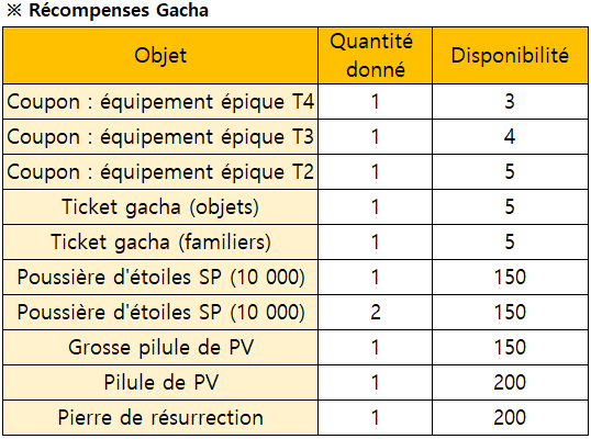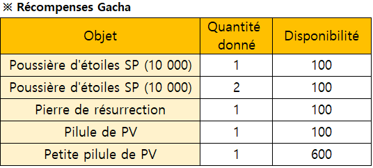 Description: Vous pouvez obtenir des objets au hasard dans ce Gacha Limité. Profitez de cette chance pour obtenir divers objets et courir la chance de gagner un prix rare !