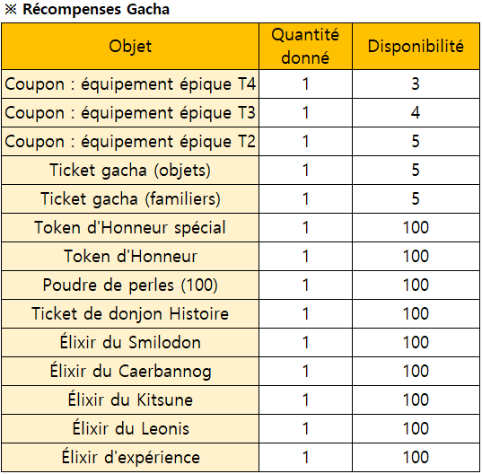 Description: Vous pouvez obtenir des objets au hasard dans ce Gacha Limité. Profitez de cette chance pour obtenir divers objets et courir la chance de gagner un prix rare !