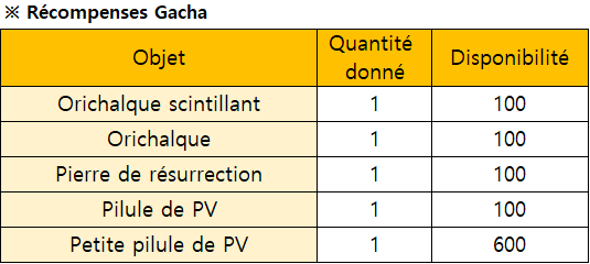 Description: Vous pouvez obtenir des objets au hasard dans ce Gacha Limité. Profitez de cette chance pour obtenir divers objets et courir la chance de gagner un prix rare !