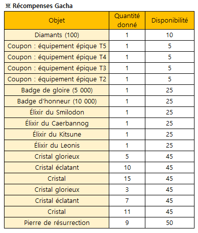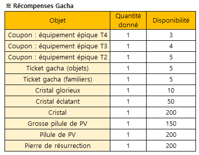 Pour les récompenses d'événements, veuillez consulter le tableau ci-dessous afin d’obtenir plus de détails.