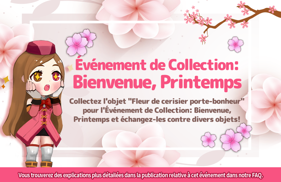 Vous recevrez des items "Fleur de cerisier porte-bonheur" lorsque vous terminez des donjons ou d’autres tâches chaque jour. Vous pouvez ensuite échanger ces items "Fleur de cerisier porte-bonheur" contre d'autres objets du Trésor.