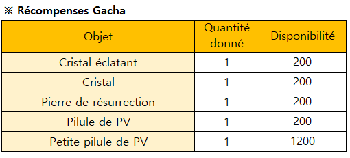 Description: Vous pouvez obtenir des objets au hasard dans ce Gacha Limité. Profitez de cette chance pour obtenir divers objets et courir la chance de gagner un prix rare !
