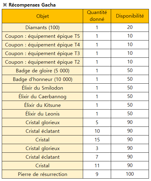 Pour les récompenses d'événements, veuillez consulter le tableau ci-dessous afin d’obtenir plus de détails.