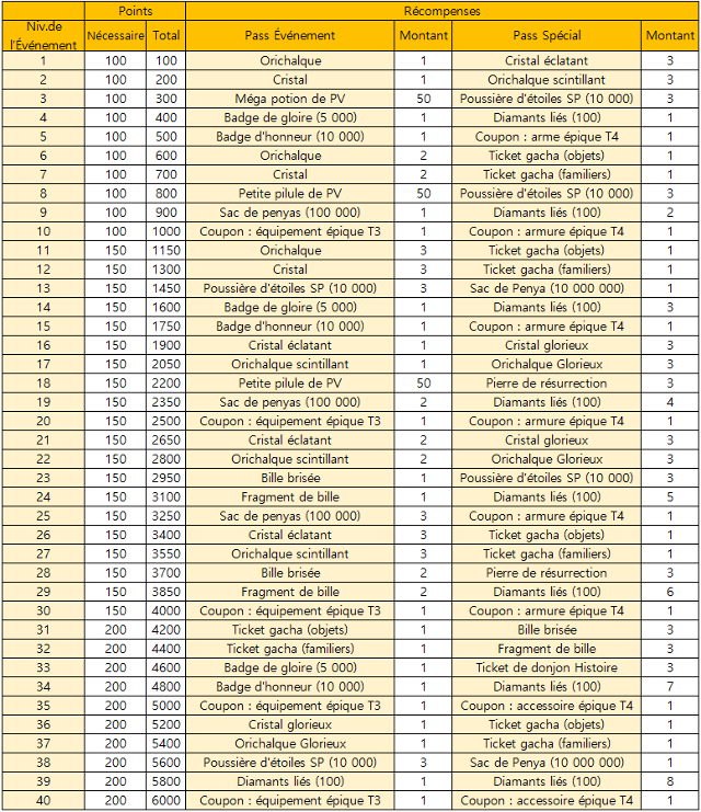 Voici les récompenses que vous pouvez recevoir pour chaque niveau d'événement !