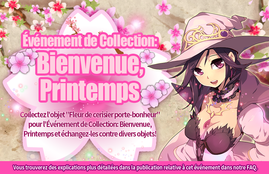 Vous recevrez des items "Fleur de cerisier porte-bonheur" lorsque vous terminez des donjons ou d’autres tâches chaque jour. Vous pouvez ensuite échanger ces items "Fleur de cerisier porte-bonheur" contre d'autres objets du Trésor.