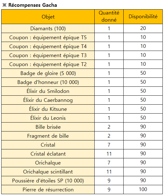 Description: Vous pouvez obtenir des objets au hasard dans ce Gacha Limité. Profitez de cette chance pour obtenir divers objets et courir la chance de gagner un prix rare !