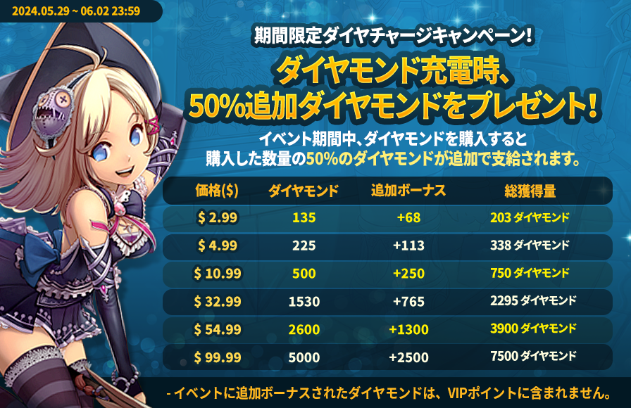 • 説明:ダイヤモンドを購入すると、50%のダイヤモンドを追加で獲得できます!