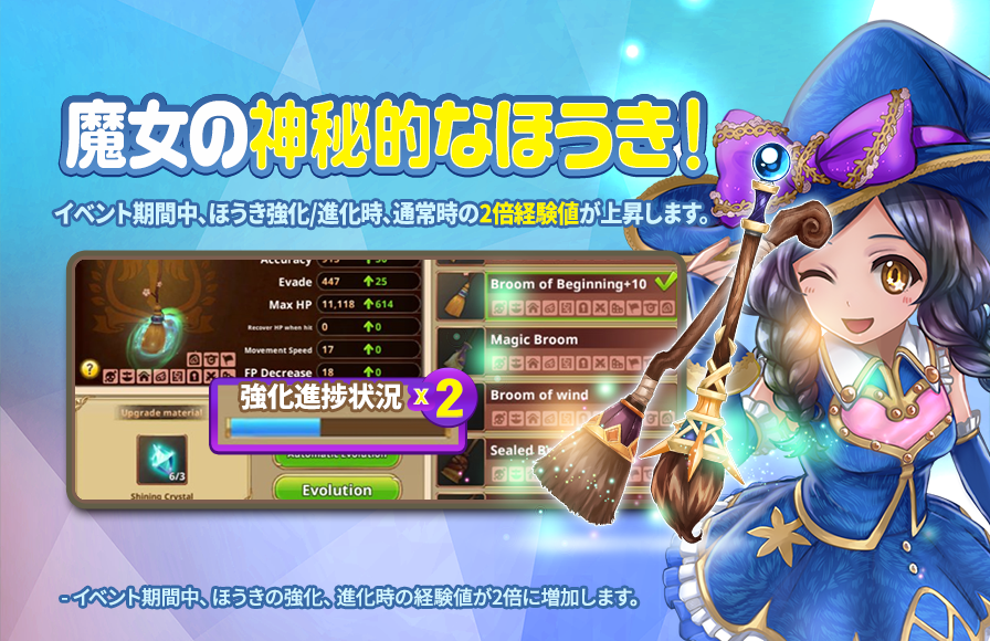 • 説明:イベント期間中、ほうき強化/進化時、通常時の2倍経験値が上昇します!