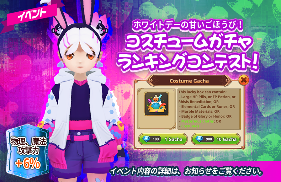 説明: 非常に珍しい複数の衣装獲得チャンスのコスチュームガチャをしたプレゼントも得ることができるチャンス!
