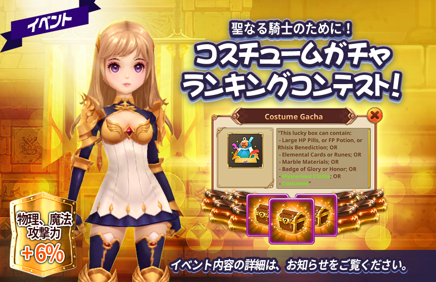 説明: 非常に珍しい複数の衣装獲得チャンスのコスチュームガチャをしたプレゼントも得ることができるチャンス!