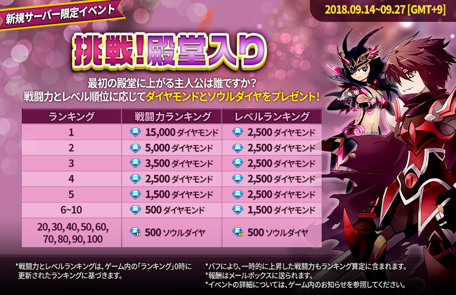 説明:戦闘力とレベルランキングに応じて、ダイヤとソウルダイヤをプレゼント致します!