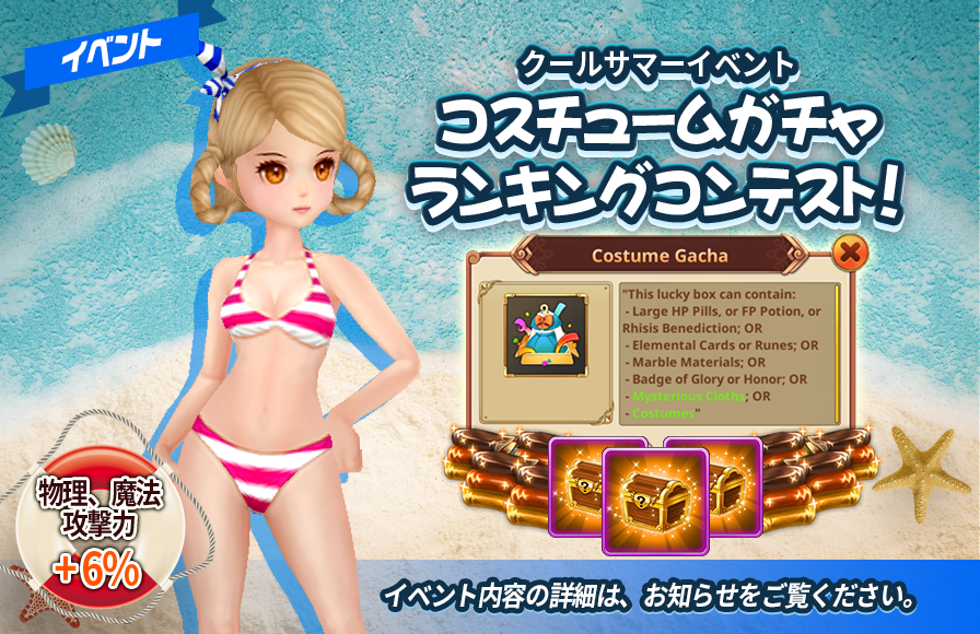 説明: 非常に珍しい複数の衣装獲得チャンスのコスチュームガチャをしたプレゼントも得ることができるチャンス!