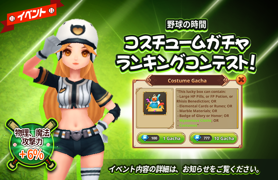説明: 非常に珍しい複数の衣装獲得チャンスのコスチュームガチャをしたプレゼントも得ることができるチャンス!