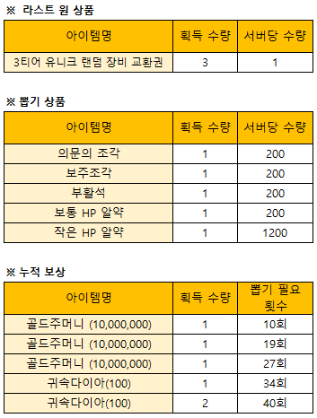 이벤트 기간 중에 획득 할 수 있는 보상은 아래와 같습니다.