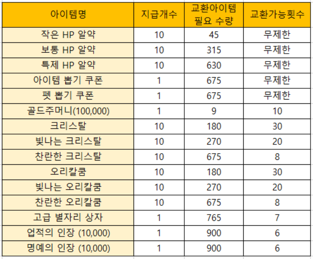 획득 할 수 있는 상품의 목록은 다음과 같습니다.