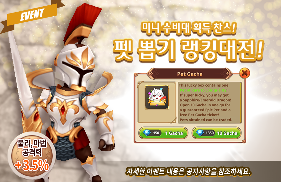 설명: 아주 진귀한 펫을 여러 개 뽑을 수 있는 수호 펫 뽑기를 하시고 보상도 얻을 수 있는 기회!