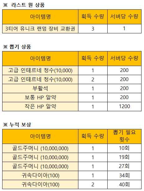 이벤트 보상은 아래의 표를 참조해주시길 부탁드립니다.