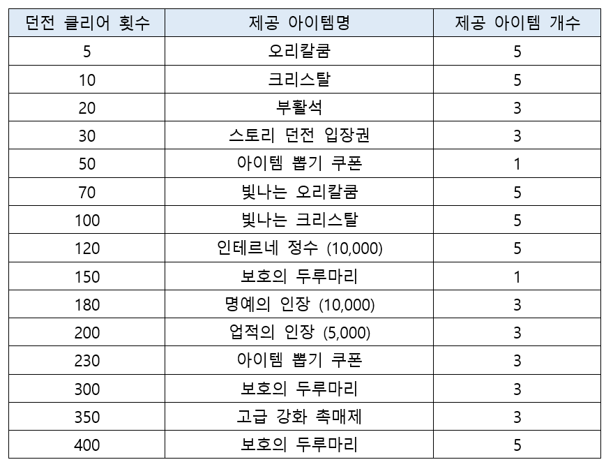 • 해당 이벤트에서 던전 클리어 횟수는 스토리 던전, 일일 던전, 파티 던전만 카운트됩니다. 이점 참고하셔서 이벤트 진행을 부탁드리겠습니다.