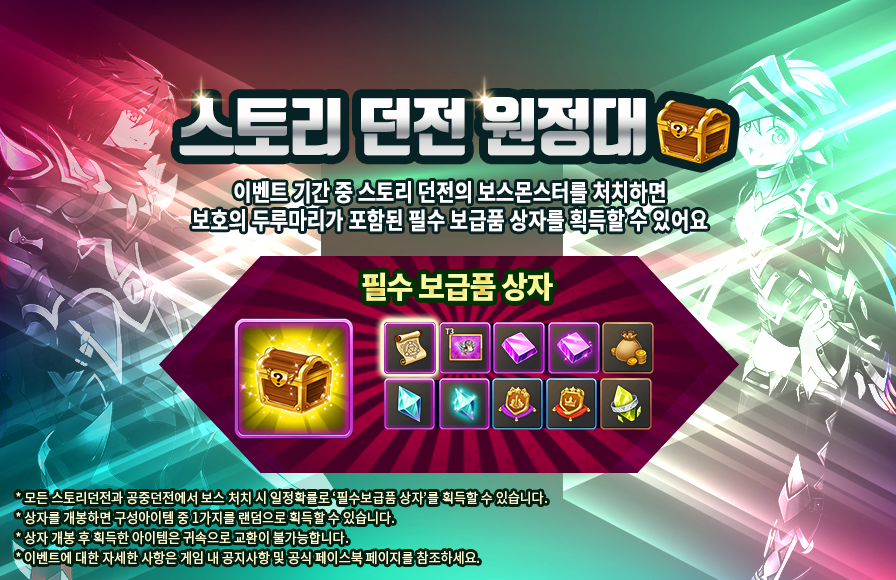 설명: 스토리 던전과 공중 던전의 보스를 처치하면 “필수 보급품 상자”와 “보호의 두루마리 상자”를 얻을 수 있어요!