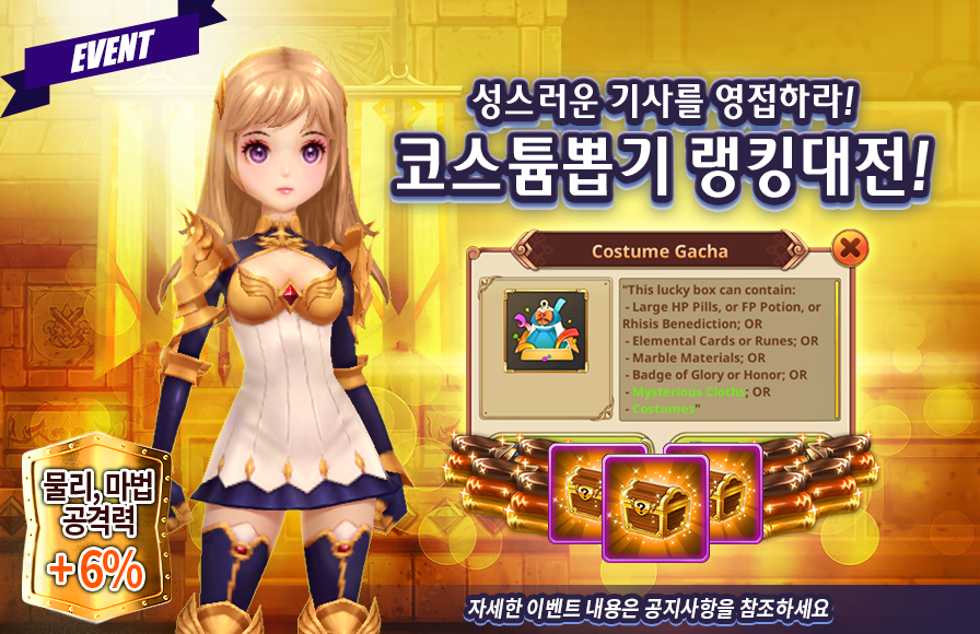 설명: 아주 진귀한 코스튬을 여러 개 뽑을 수 있는 코스튬 뽑기를 하시고 상품도 얻을 수 있는 기회!